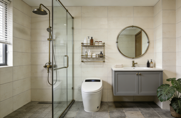 玻璃遏制作念干湿分离,洗漱、如厕、淋浴互不过问,根绝水汽扩散。浅米色墙砖+相沿灰地砖,柔软不闪耀;浅胡桃木色浴室柜+圆形金属框镜子,中庸瓷砖冷硬感,相沿又温顺。智能马桶+相沿花洒,晋升使用昌盛度;金属置物架收纳洗漱用品,旯旮龟背竹点缀,小空间也有期望。