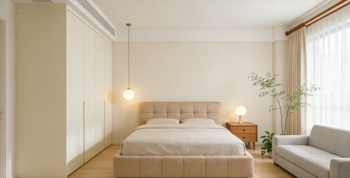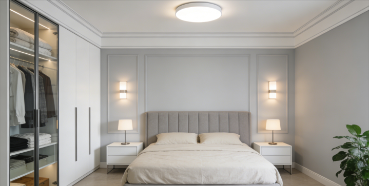 靠墙作念白色哑光一门到顶衣柜,隐形拉手书约大气,里面分区收纳衣物、被褥;玻璃推拉门衣帽间,视觉拓宽空间,收纳量拉满。暖白光吸顶灯+床头壁灯,分层照明不闪耀,熬夜看书不惊扰家东说念主,细节拉满居住幸福感。