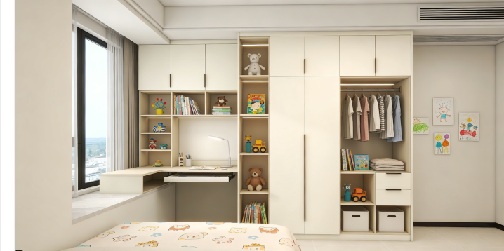 拒绝传统榻榻米,汲取衣柜+书桌一体化打算,12大分区收纳,玩物、绘本、衣物有序摆放。可转化升降书桌,适配孩子不同成长阶段,贴窗摆放采光填塞;床品选淡色系卡通款,墙面挂孩子涂鸦作品,童趣满满又呼应举座奶油基调,留出填塞算作空间,孩子玩耍更摆脱。