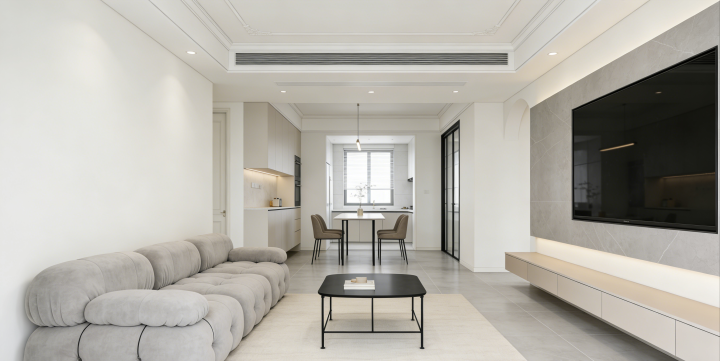 电视配景墙不作念复杂造型,浅灰色岩板+悬浮电视柜组合,无拉手打算干净利落,藏起机顶盒、杂物,台面留白更显显露;浅灰色布艺云朵沙发+玄色金属细腿茶几,优柔又轻细,搭配淡色系地毯,久坐不累还显空间大。