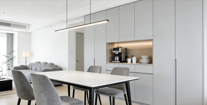 餐厅紧邻客厅,长方形岩板餐桌+灰色磨砂面黑腿餐椅,检朴耐看又耐脏;上方线性吊灯聚焦用餐区,暖光氛围拉满。一侧作念淡灰色一门到顶餐边柜,中间镂空区摆放咖啡机、餐具,收纳+展示双在线,平日用餐、亲子互动、一又友小聚齐沉着。