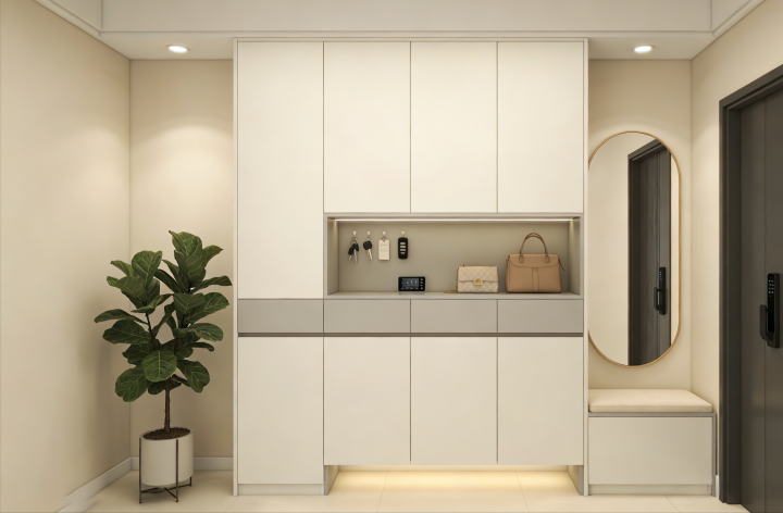 扬弃复杂造型,作念奶白色+浅灰拼接玄关柜,一门到顶打算最大化愚弄垂直空间,根绝积灰死角。中间留镂空区放钥匙、包包、门禁卡,平日取用不蹙悚;底部悬空15cm,常穿鞋顺手放,扫地机器东说念主摆脱相差,清洁无压力。