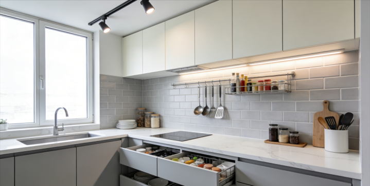 抽屉+柜门组合分类收纳,调料、厨具、餐具各归其位;墙面金属置物架挂锅铲、勺子,开释台面空间。明装轨说念灯照亮操作区,无暗影更宽心,扩大窗户引入当然光,小厨房也不压抑。