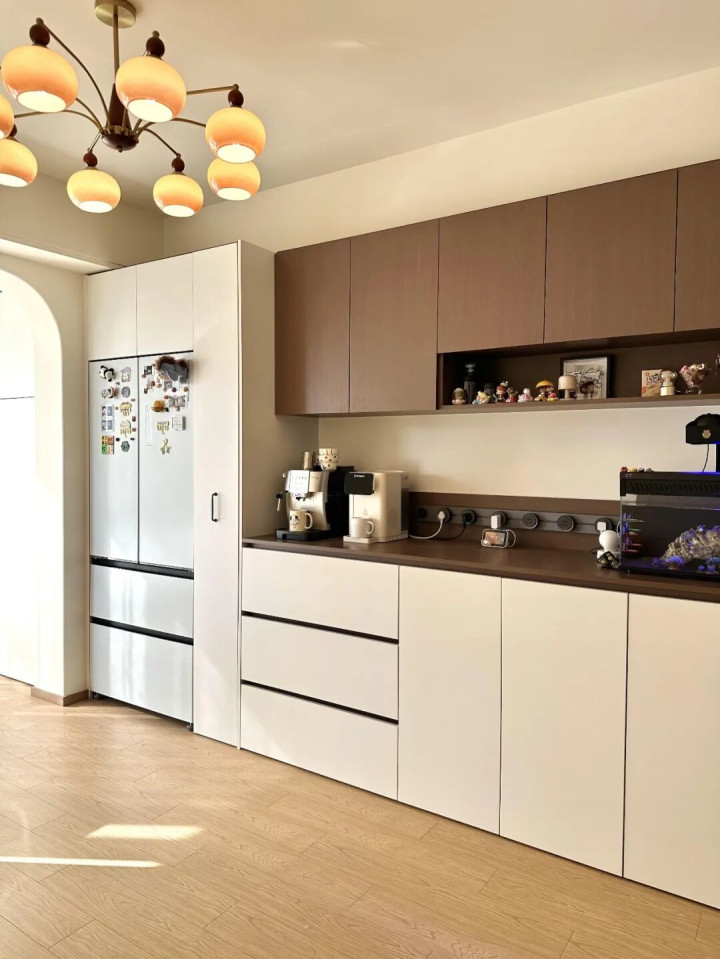 网友@金闪闪 家,把雪柜与餐边柜、水吧台伙同在全部,为了与雪柜王人平,作念的60cm深的餐边柜,吊柜内收,餐边柜台面通盘的小家电都能放得下,这样雪柜严丝合缝,未必好意思不雅,视觉上也不显突兀。