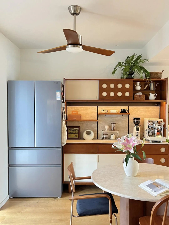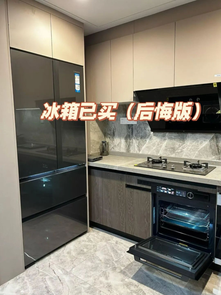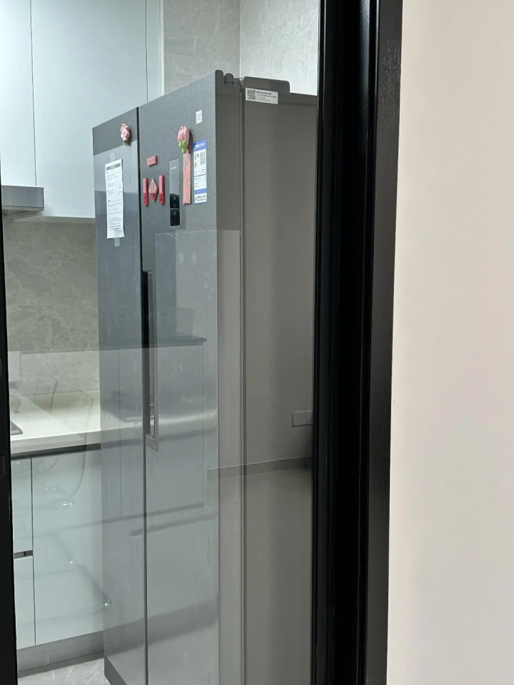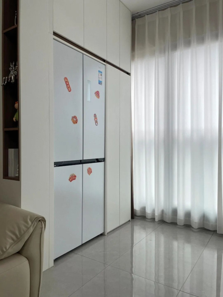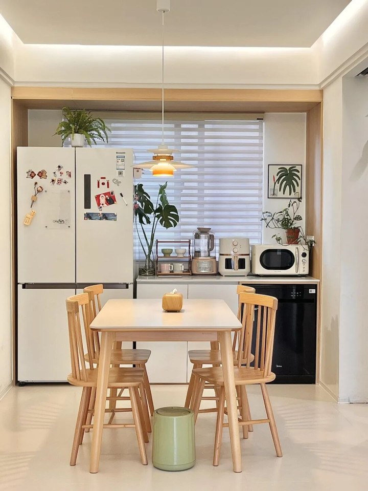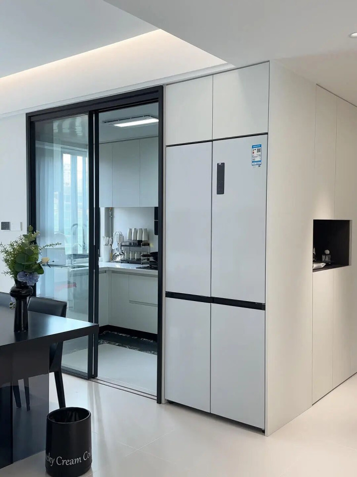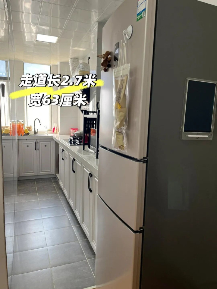 不作念镶嵌式,平直放餐厅边际也可以,网友@田田不甜有点酸 家,厨房小的不成再小了,是以,把雪柜安排在餐厅。