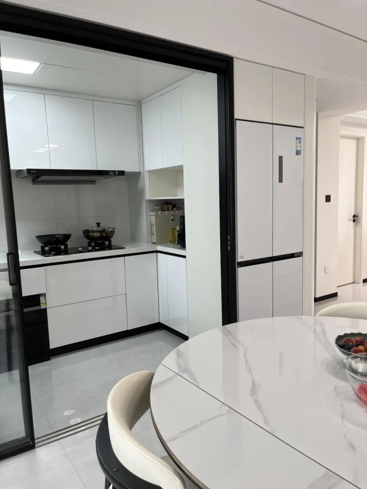 网友@洋仔的窝 家便是这样,他家厨房5平米,橱柜作念完莫得空间放雪柜了,于是把厨房的墙砸了,作念了通顶玄关柜和转角雪柜柜,把双开门雪柜嵌进去,落地后果好意思不雅大气,使用也未必。