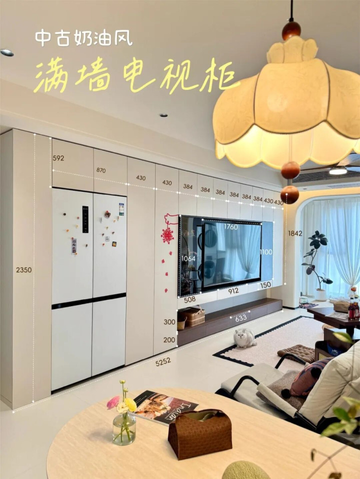 还有网友@咱们家有点小好意思 的,把雪柜镶嵌在满墙电视柜里面,因为雪柜比拟深,是以借用了主卧床尾柜的少许空间。