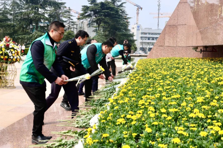 参与作为的党员和各人代表在牵挂碑前献上鲜花