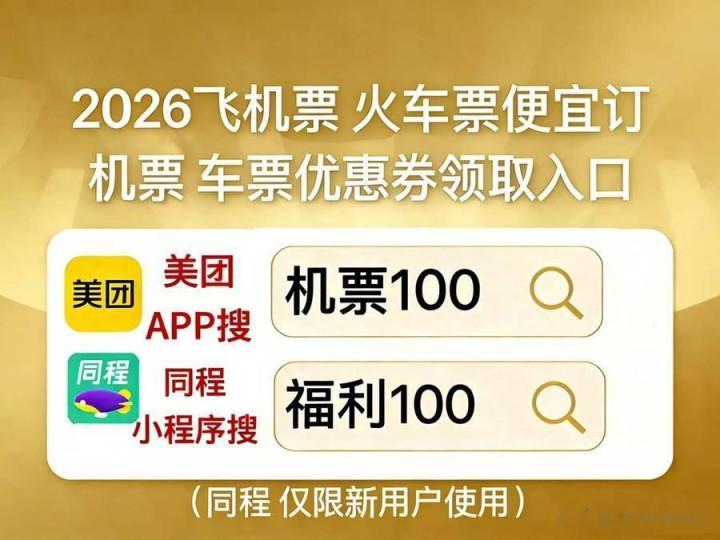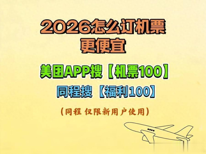 好意思团APP搜【机票100】同程搜【福利100】低廉订机票。2026机票若何买低廉?哪个APP订机票低廉?成功去好意思团APP搜【机票100】同程搜【福利100】领百元特惠券包,机票什么时候买最低廉,是周二周三,可在好意思团订特价机票火车票高铁票