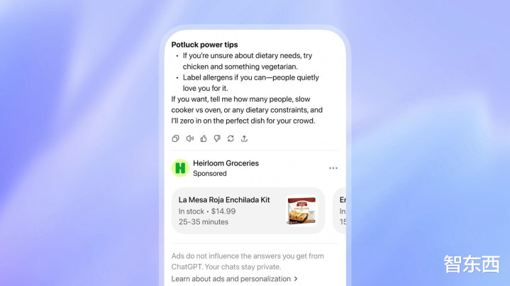 告白展示位置位于ChatGPT回应的底部,带有显著“援救”象征,不会影响ChatGPT的回应内容,用户对话数据也不会被出售给告白主,18岁以下用户不会看到告白,政事、健康和热情健康等明锐话题近邻也不会展示告白。