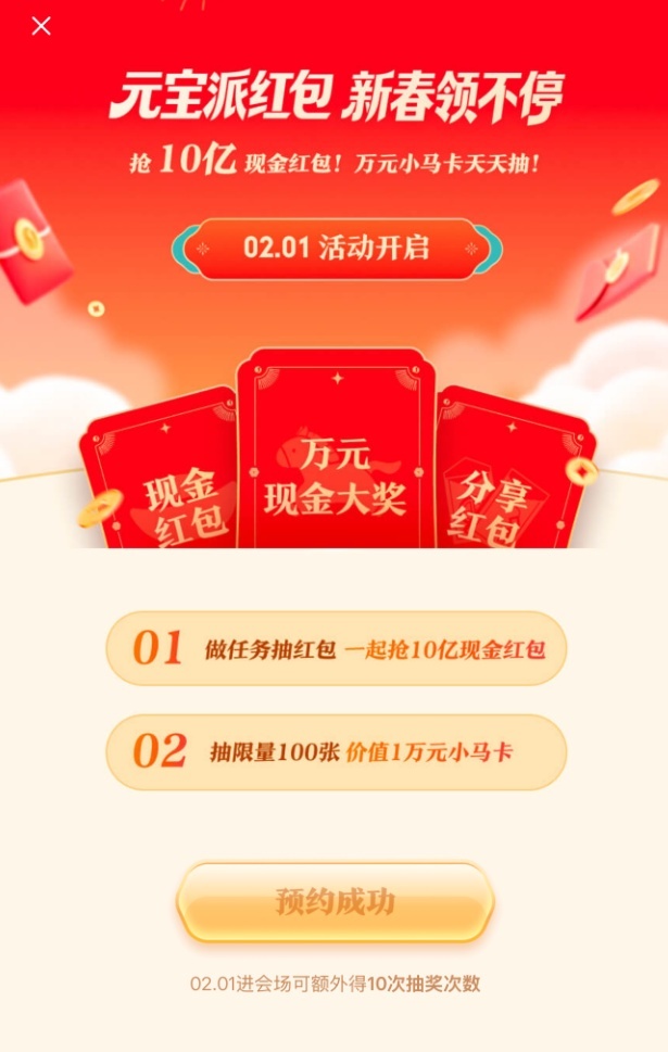 1月25日,腾讯元宝发布《对于春节分10亿现款的奉告》。奉告称,为回馈弘远用户,元宝将在2月1日开启新春活动,分10亿元现款红包。App内点击预约卡片可参加春节会场,提前预约的用户将在2月1日活动开启今日,颠倒获取10次抽奖契机。