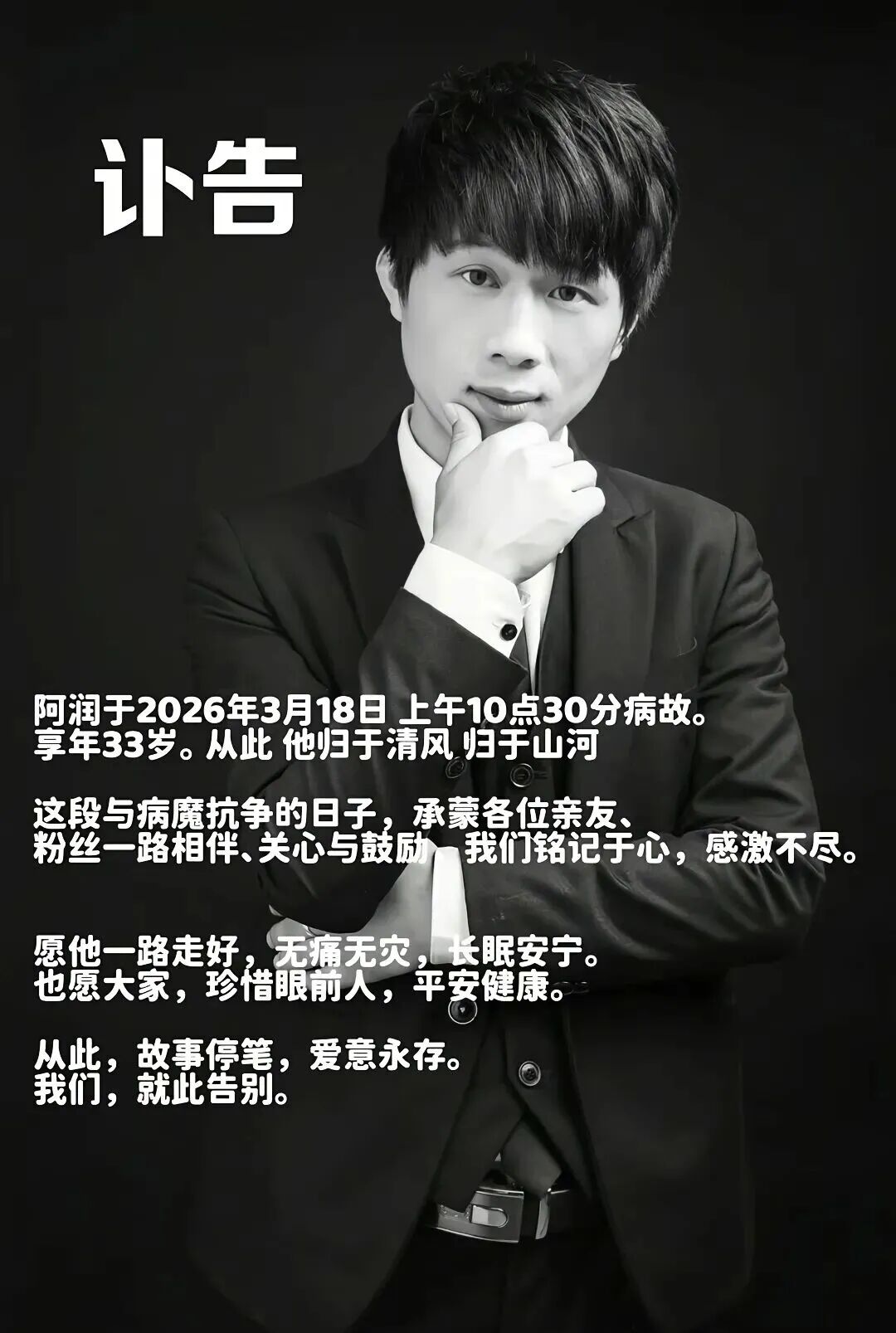 3月18日,33岁抗癌博主“润哥”死字。家东说念主在酬酢平台发布讣告: