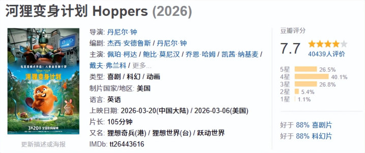 据传,这部《河狸变身规划》的制作资本高达10亿东说念主民币,在北好意思上映后口碑和票房齐呼吁大进,上映首周末三天狂揽2.9亿东说念主民币,烂番茄极新度高达97%,被誉为“顶级皮克斯水准”。