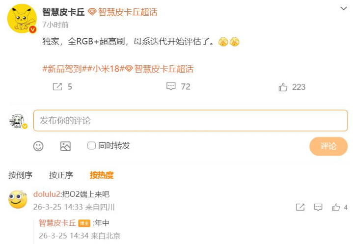 微博截图 · 博主爆料小米18评估全RGB+超高刷